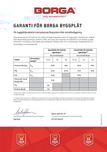 Borga lämnar garanti för kvaliteten på färgsystemet som används på byggplåt för byggprojekt i Skandinavien i enlighet med ”Allmänna villkor samt regler för installation och underhåll” samt vid händelse av giltig reklamation i omfattning enligt ”Garantiåtagande för Borga byggplåt”, vilka finns i Garantivillkor Bilaga 1 under dokument för nedladdning.