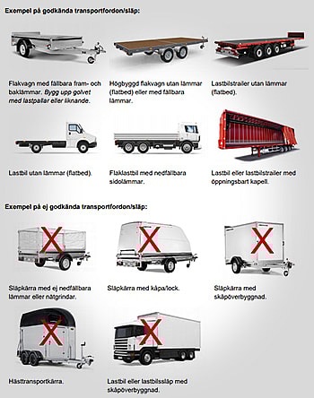 Se instruktionen Godkända Lastfordon till höger för att se vilka släpvagns- och fordonstyper som fungerar bra. Tänk också på att lastfordonets längd bör vara så väl tilltaget att endast marginellt överhäng av lasten uppstår.