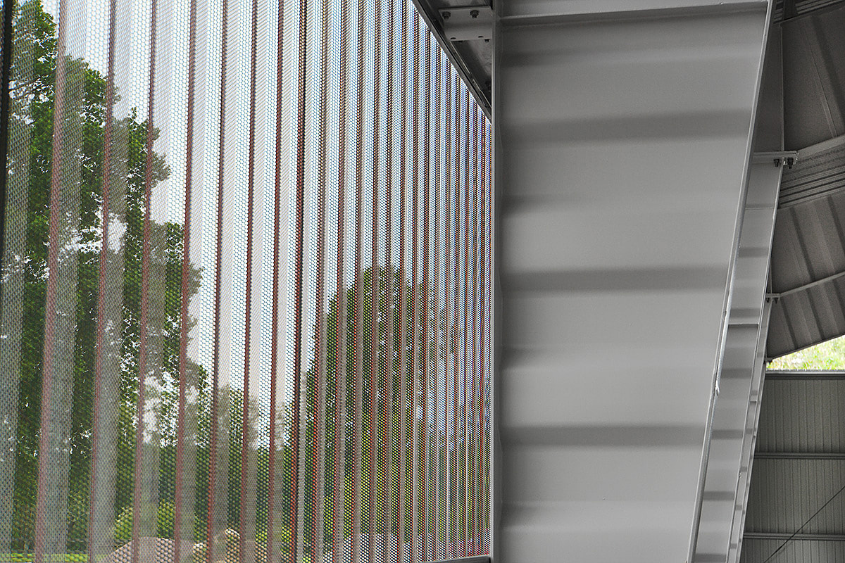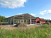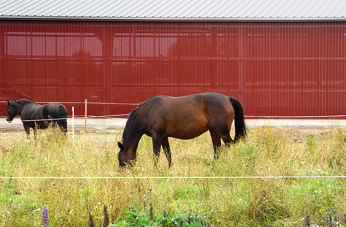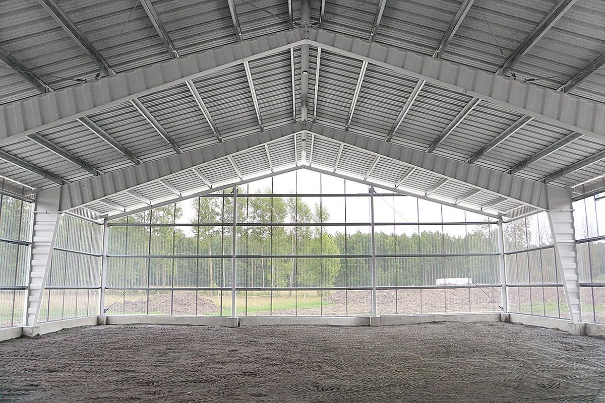 En ridhall med perforerad väggplåt. Perforeringen ger ridhuset ett bra klimat och de transparenta väggarna ger en härlig känsla av att fortfarande vara utomhus.